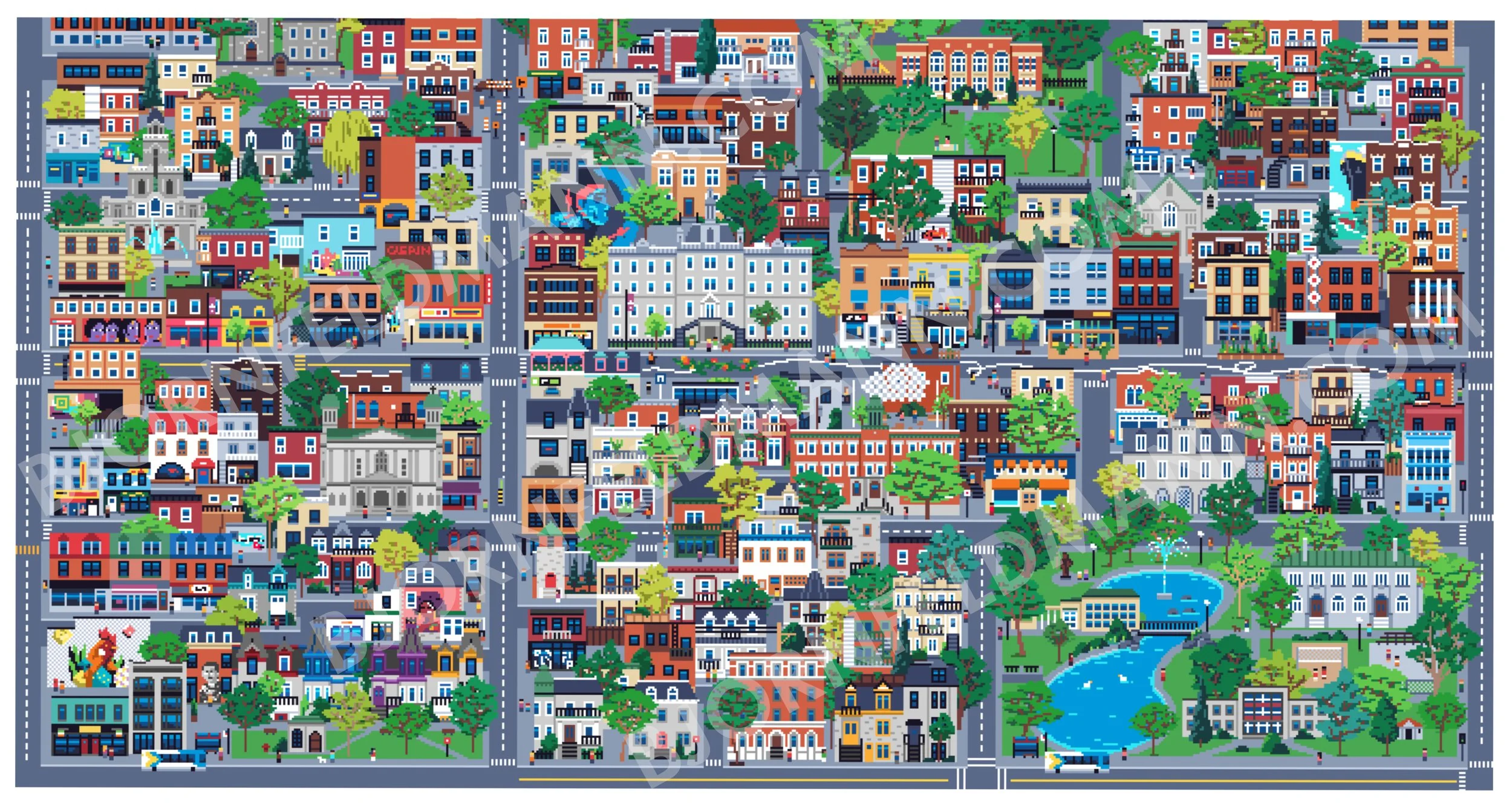 Une partie d’une carte de Montréal avec ses principaux quartiers et monuments dessiné pixel par pixel. En cours